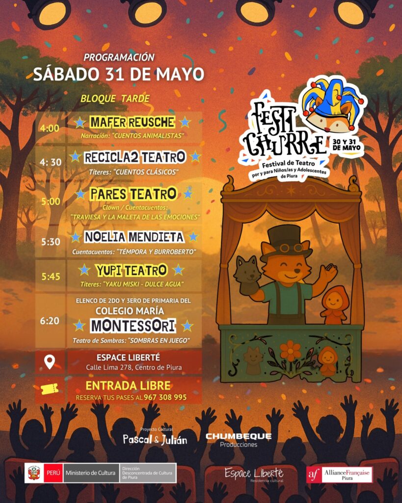 Invitamos a toda la comunidad piurana a participar del 1er Festival de Teatro por y para niños, niñas y adolescentes de Piura, que busca su acercamiento con las artes escénicas, a través un evento gratuito con más de 100 artistas locales (entre adultos y menores), en 18 presentaciones teatrales y una expolibro.