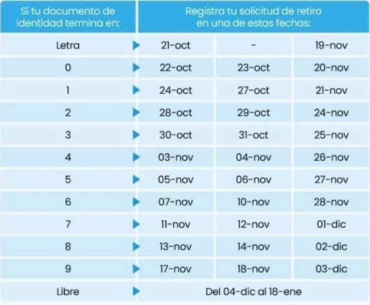 - Si tu DNI finaliza en 0, registra tu solicitud de retiro el 22 y 23 de octubre, y el 20 de noviembre.