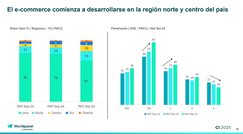 “Finalmente, es importante capitalizar crecimientos desde el e-commerce, especialmente en los niveles socioeconómicos (NSE) altos y medios. Este año la penetración de dicho canal en los hogares peruanos llegó a 36%, mientras que en el segmento A/B asciende a 62% y en el C a 40%”, apunta Mauricio Cheng Matsuno.
