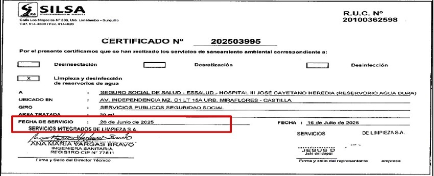 El informe advierte, además, la presencia de fisuras, humedad, desprendimiento de baldosas y deterioro de puertas en áreas como emergencia, farmacia, dirección y cocina. Estas condiciones podrían ocasionar accidentes y afectar la integridad física tanto de pacientes como de trabajadores. A ello se suma el riesgo en la calidad del agua, debido a que el hospital no cuenta con certificados vigentes de limpieza y desinfección de cisternas; los últimos registros datan de junio del año pasado, lo que podría generar contaminación y enfermedades.