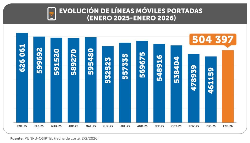 De acuerdo a la información proporcionada por el Administrador de Base de Datos de Portabilidad (ABDP) al OSIPTEL, después de dos meses con registros que se situaron por debajo del medio millón de operaciones, en enero de este año, el número de portaciones creció 9.38 % respecto a diciembre de 2025 (461 159), lo que es una muestra de la intensa competencia entre las empresas operadoras por captar nuevos usuarios y fidelizar a los actuales.