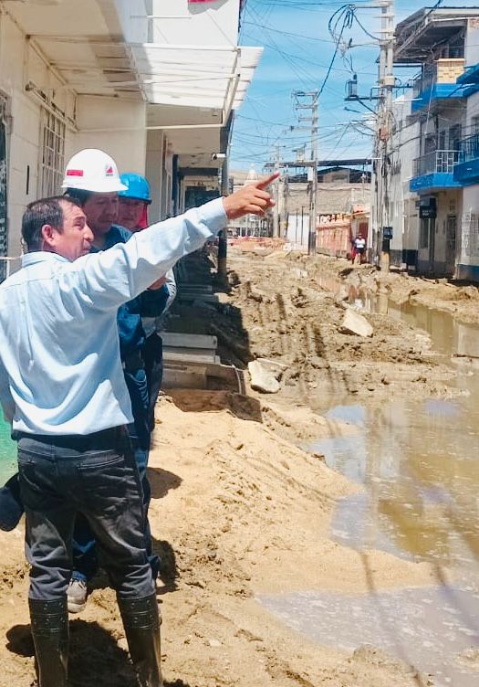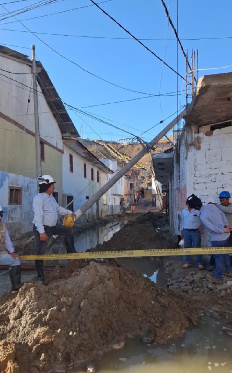 Se verificó que una contratista ejecuta trabajos de pistas y veredas en la zona y que, producto de las excavaciones y las lluvias, las bases se debilitaron. Los postes fueron apuntalados de manera provisional para estabilizarlos y evitar afectaciones al servicio eléctrico. La contratista ya fue ubicada y viene retirando el agua empozada para permitir el acceso y proceder con la reparación definitiva.
